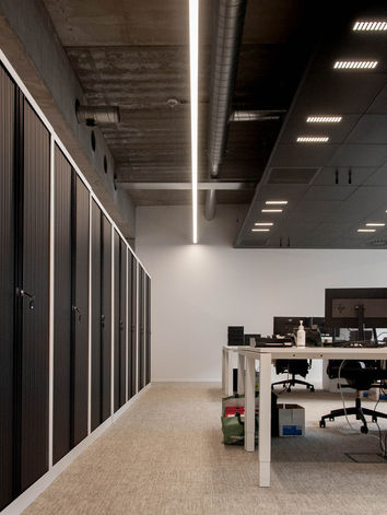 Un look industriel a été choisi pour ce projet de bureau, un aspect renforcé encore par la combinaison de béton brut avec des îlots de plafonds noirs. Les îlots sont limités aux zones de travail, où l’on a choisi des dalles acoustiques perforées. Les modules compacts 'Frost C' assurent l’éclairage nécessaire aux postes de travail.